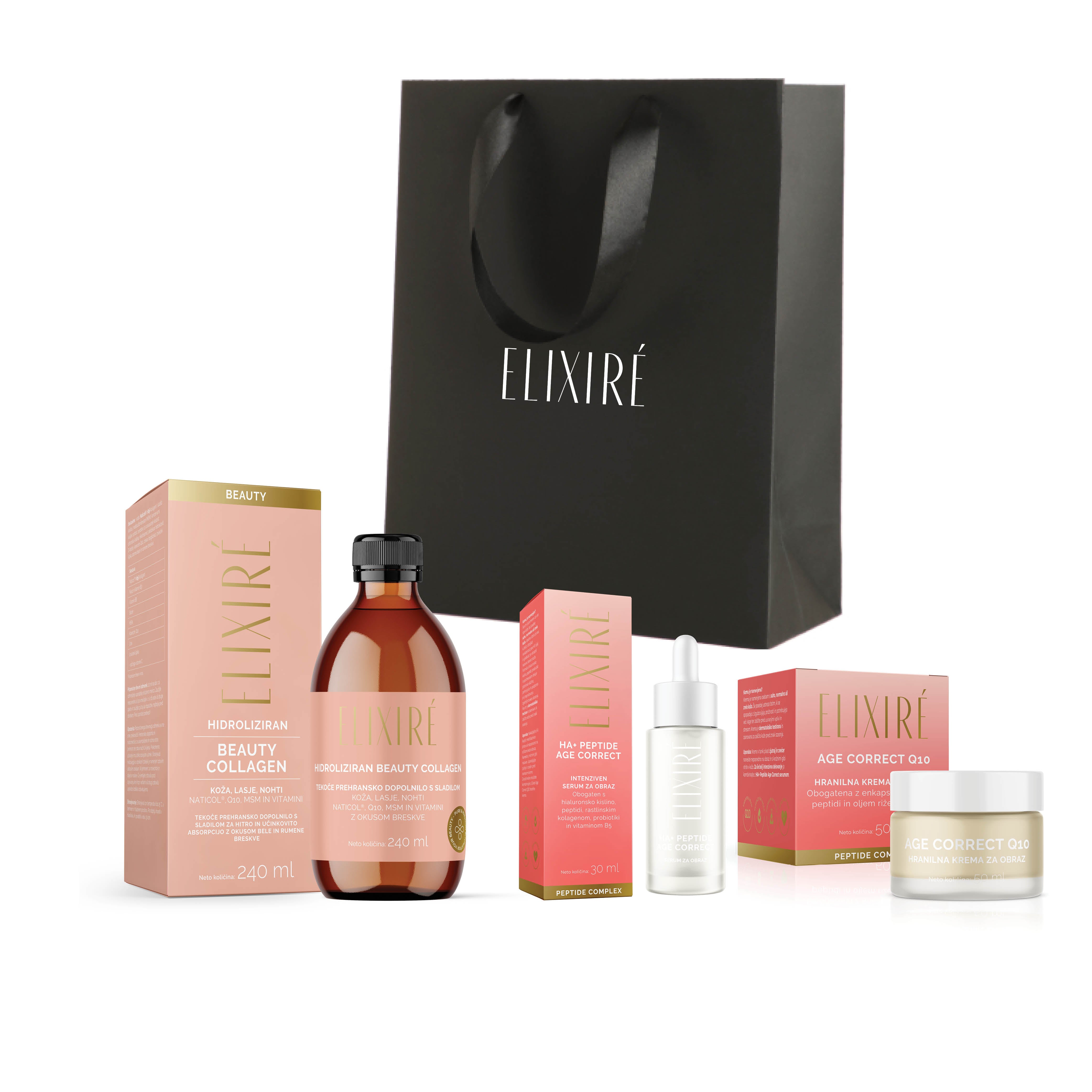 Il pacchetto combina Elixiré Collagen, Elixiré Age Correct Q10 cream e Elixiré HA + PEPTIDE Age Correct Serum, che insieme forniscono un supporto intensivo per la pelle, capelli e unghie.